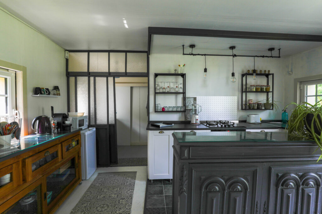 Dans le prolongement de la maison, un bâtiment atypique (ancien haloir) en briques et pierre de Roussier à aménager (65 m2) et un bâtiment colombage et toiture ardoise avec cheminée à aménager également (40 m2).