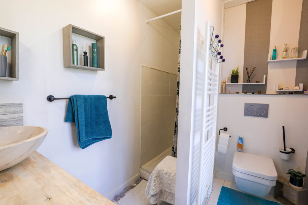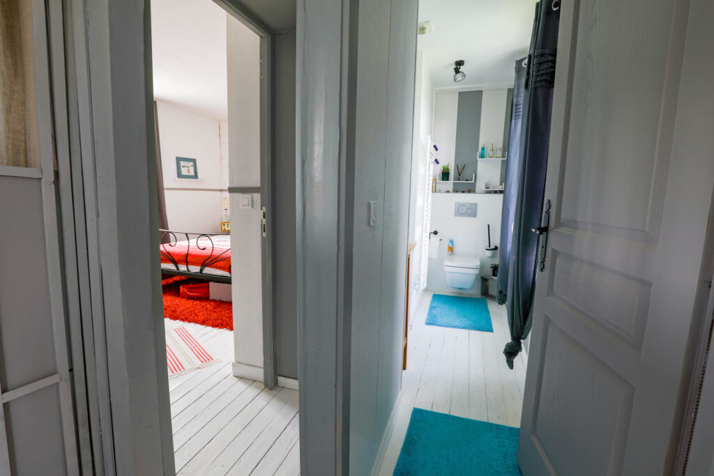 – Au premier étage, un palier, une salle d’eau avec douche, lavabo, WC et sèche-serviettes, trois chambres lumineuses avec dressing (16, 14 et 11 m2).