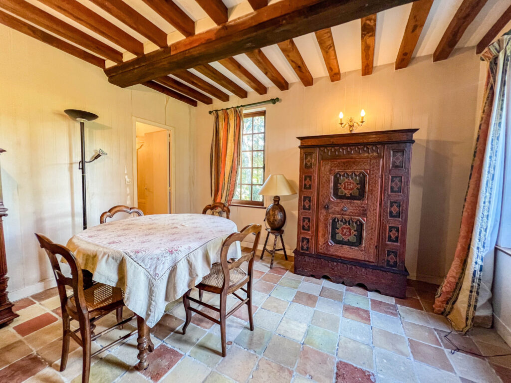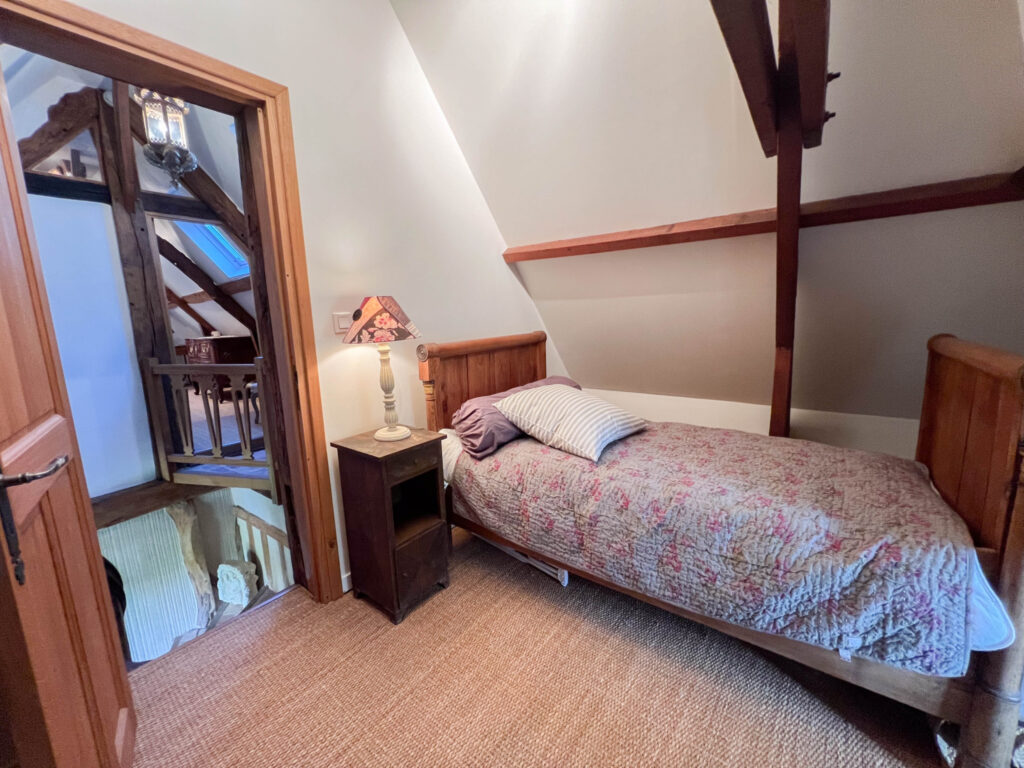 Derrière un portail électrifié, un parc arboré traversé par la rivière Viette contient : – Un manoir en très bon état en colombages, le toit recouvert de tuiles anciennes se composant comme suit : Au RDC traversant dont le sol est recouvert de tomettes anciennes, une entrée avec un escalier d’époque à main courante, à droite une pièce faisant office de salle-à-manger (possibilité chambre) se prolongeant par une salle-de-bains avec WC, lavabo etplacard. A gauche de l’entrée un grand salon avec une alcôve en angle, grande cheminée en pierre blanche avec poêle. Puis en enfilade une cuisine aménagée lumineuse . Au premier étage, sol en parquet de chêne, une chambre avec salle-de-bains, WC et lavabo, un grand salon avec cheminée et poêle, une autre chambre avec salle-de-douche, lavabo et WC. Au deuxième étage ont été aménagées une petite chambre, une grande chambre avec sa salle de douche, WC et lavabo. Le confort est assuré par le chauffage au bois et des radiateurs électriques. L’assainissement est de type tout-à-l’égout. – Un bâtiment en colombages et toit en tuiles fermé aux deux tiers offrant un double garage et un atelier d’un côté et une terrasse couverte de l’autre. Le tout sur un terrain de 9 923 m2 , un parc valloné bien entretenu avec de grands arbres et scindé par une rivière. Chauffage électrique et bois, alarme.