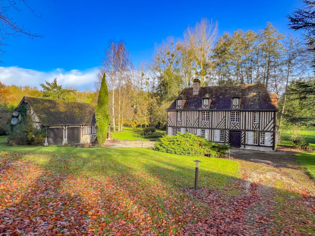 Derrière un portail électrifié, un parc arboré traversé par la rivière Viette contient : – Un manoir en très bon état en colombages de 190 m2 environ, le toit recouvert de tuiles anciennes se composant comme suit : Au RDC traversant dont le sol est recouvert de tomettes anciennes, une entrée avec un escalier d’époque à main courante, à droite une pièce faisant office de salle-à-manger (possibilité chambre) se prolongeant par une salle-de-bains avec WC, lavabo etplacard. A gauche de l’entrée un grand salon avec une alcôve en angle, grande cheminée en pierre blanche avec poêle. Puis en enfilade une cuisine aménagée lumineuse . Au premier étage, sol en parquet de chêne, une chambre avec salle-de-bains, WC et lavabo, un grand salon avec cheminée et poêle, une autre chambre avec salle-de-douche, lavabo et WC. Au deuxième étage ont été aménagées une petite chambre, une grande chambre avec sa salle de douche, WC et lavabo. Le confort est assuré par le chauffage au bois et des radiateurs électriques. L’assainissement est de type tout-à-l’égout. – Un bâtiment en colombages et toit en tuiles fermé aux deux tiers offrant un double garage et un atelier d’un côté et une terrasse couverte de l’autre. Le tout sur un terrain de 9 923 m2 , un parc valloné bien entretenu avec de grands arbres et scindé par une rivière. Chauffage électrique et bois, alarme.